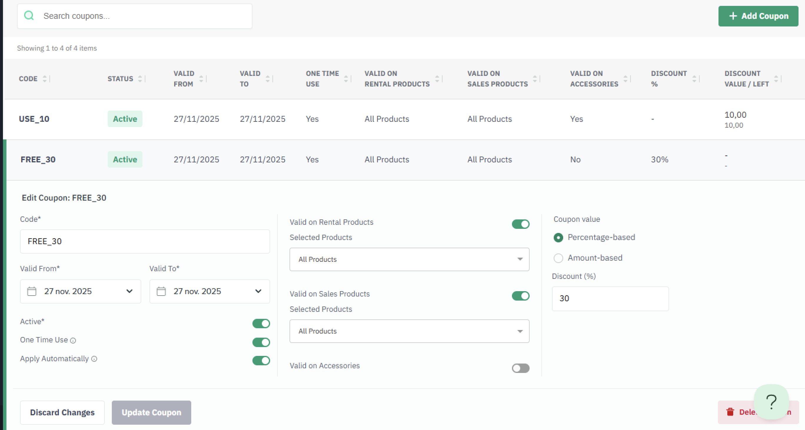 Valid on Accessories: Specify if coupon should apply to rental accessories