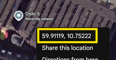 latitude, longitude(e.g.59.9099992, 10.7531768)