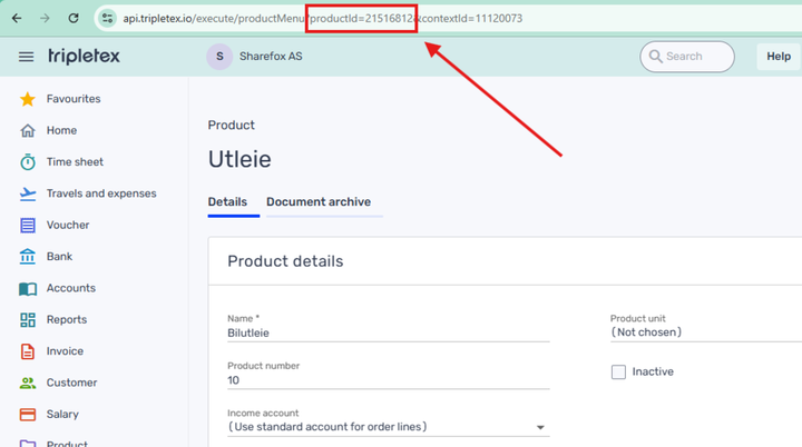 Logg inn i Tripletex. Under "Products" > "Products" velger du det aktuelle produktet. Nå finner du ProducID i adressefeltet i nettleseren. (Se screenshot)