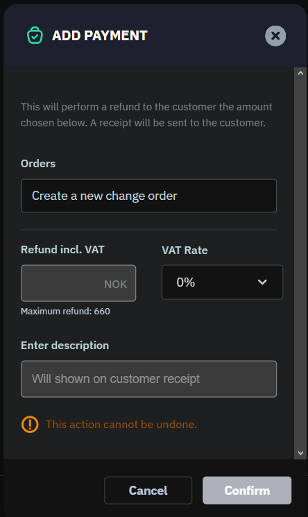 - Enter the refund description and amount in to the popup window and then click "Confirm".